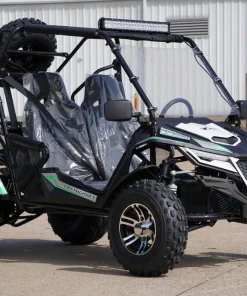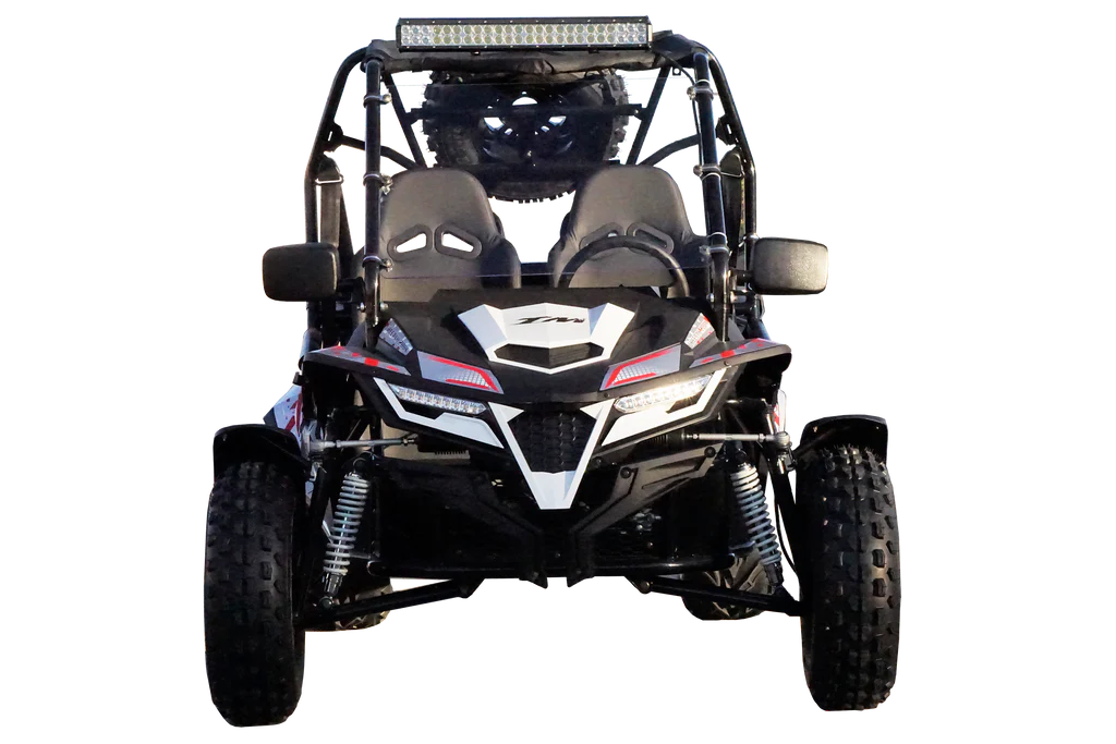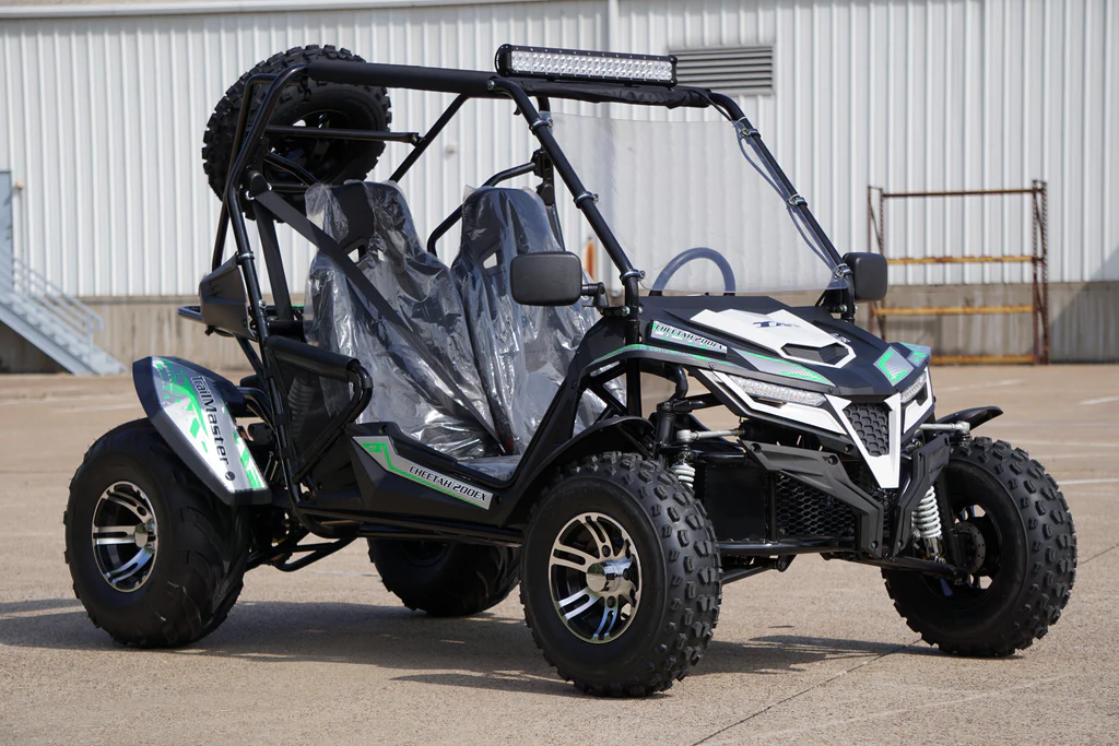 True to its namesake, the Cheetah 200X is sleek, powerful, fast, and agile with the power plant, drivetrain, suspension of a high-performance go-kart, and the functionality of a utility vehicle. Extra-long, independent front swing arms, a double ball joint, articulating rear suspension and ample ground clearance let you glide over the roughest terrain and perform like independent suspension making it much harder to flip over. Adjustable high-back bucket seats and an adjustable steering wheel will accommodate teens and adults, An automatic CVT transmission with reverse, hydraulic disk brake, 3-point automotive-style retractable seat belts, parking brake, fenders, canopy top, and cargo rack are just a few of the many special features.